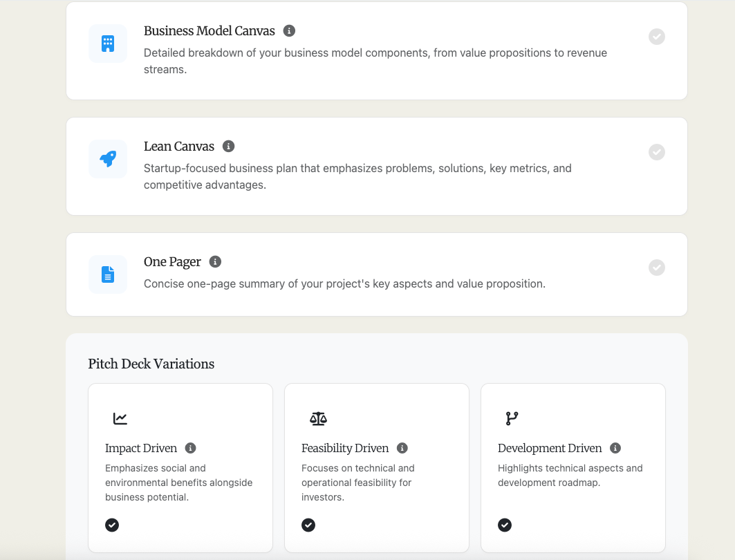 Access three distinct project pitch versions and a streamlined one-pager, all conveniently located under the new "Reports" tab of your Projects. Perfect for presenting your project's vision with clarity and impact. We've also reorganized the menu for intuitive access. "Analyses" (Landscape, Market Size, Competitive, Job Map) and "Reports" (Pitches, One-Pager, Business Model Canvas, Lean Canvas) are now clearly separated, allowing you to find what you need instantly.