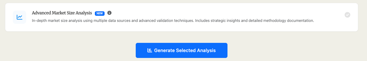 Our new advanced market sizing report provides a thorough, data-driven estimate of your potential market - one of the most challenging aspects of business planning. Using a sophisticated framework of 12 specialized AI agents working in concert, the system generates thoughtful market size estimates based on multiple methodologies and data points. Just request your analysis and a comprehensive report will be conveniently delivered to your email upon completion.