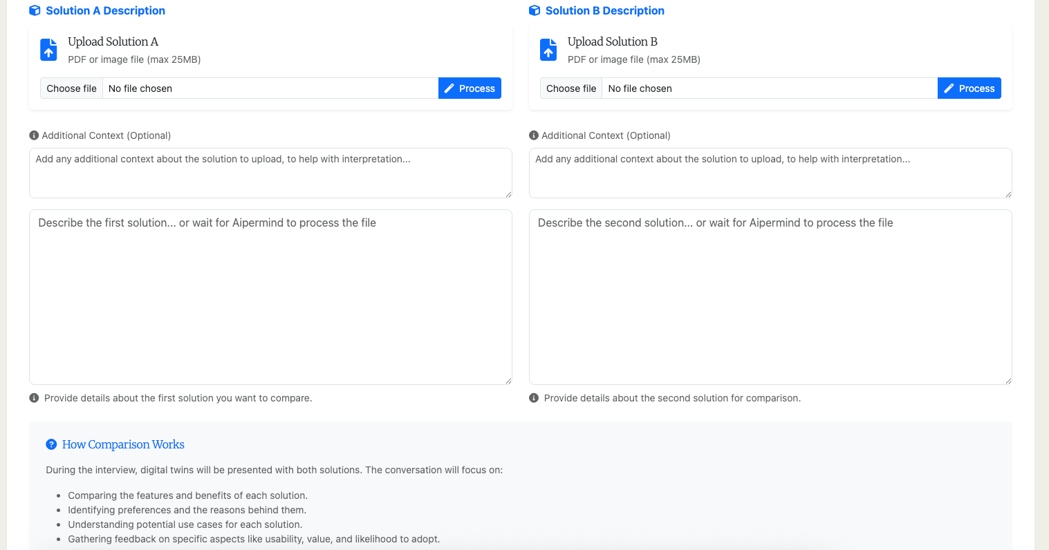 Understanding how different versions of your solution stack up is critical for decision-making. So is how your solution compare with the competition. Our new Comparison Test lets you: Evaluate two distinct solutions or iterations side-by-side Witness how your Digital Twins analyze and compare them See which elements of value matter most to each stakeholder Identify clear winners based on specific perspectives The system dynamically extracts value propositions according to each Digital Twin's unique viewpoint—delivering insights impossible to gather through traditional methods.