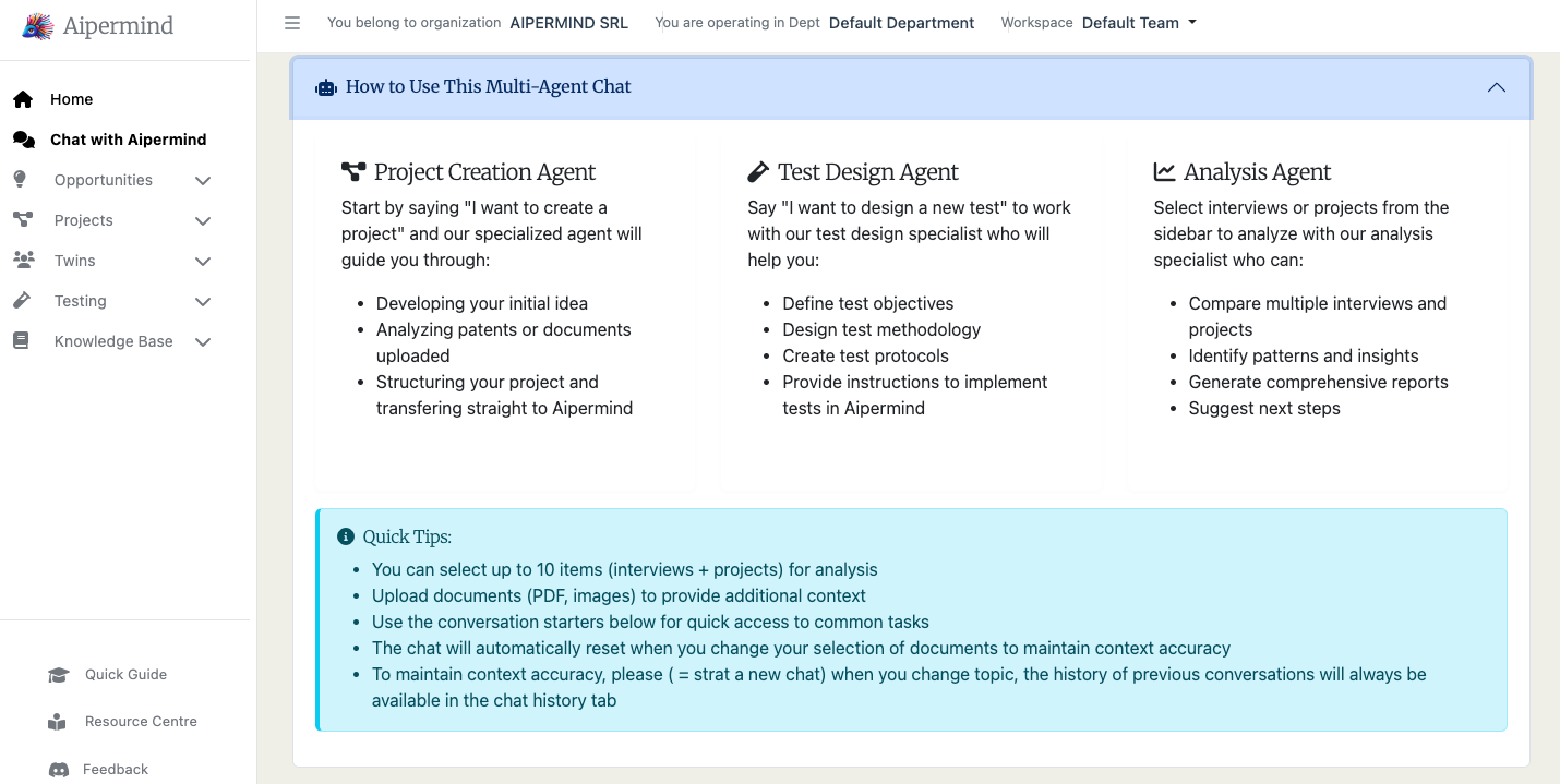 Our new multi-agent chat system provides comprehensive guidance throughout your innovation journey: