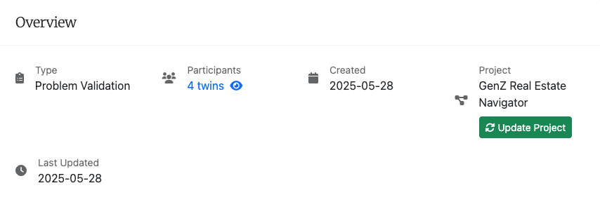 When chatting with Synthetic Twins, you'll now see the specific project name and version they originated from. This contextual information becomes useful as your twin library expands, ensuring you always understand which market assumptions inform each conversation.